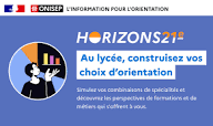 HORIZON21Plateforme numérique du Ministère de l’Éducation nationale et de l’ONISEPDestinée à aider les lycéens (2de, 1re, voie générale et technologique) à choisir leurs spécialités et à comprendre les débouchés en termes d’études et de métiershttps://www.onisep.fr/horizons21